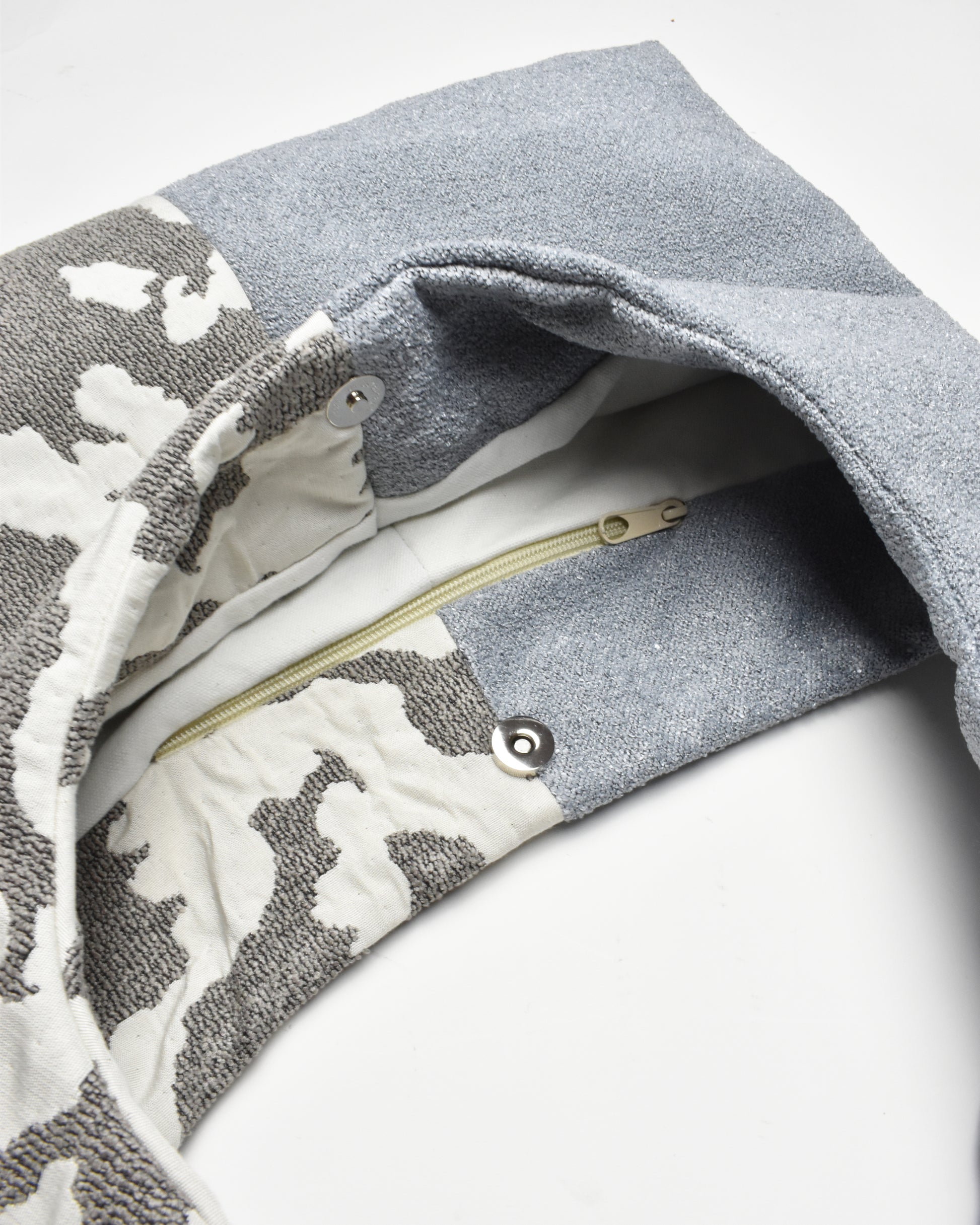 This bag has a magnetic button closing and a small inside zipper pocket.