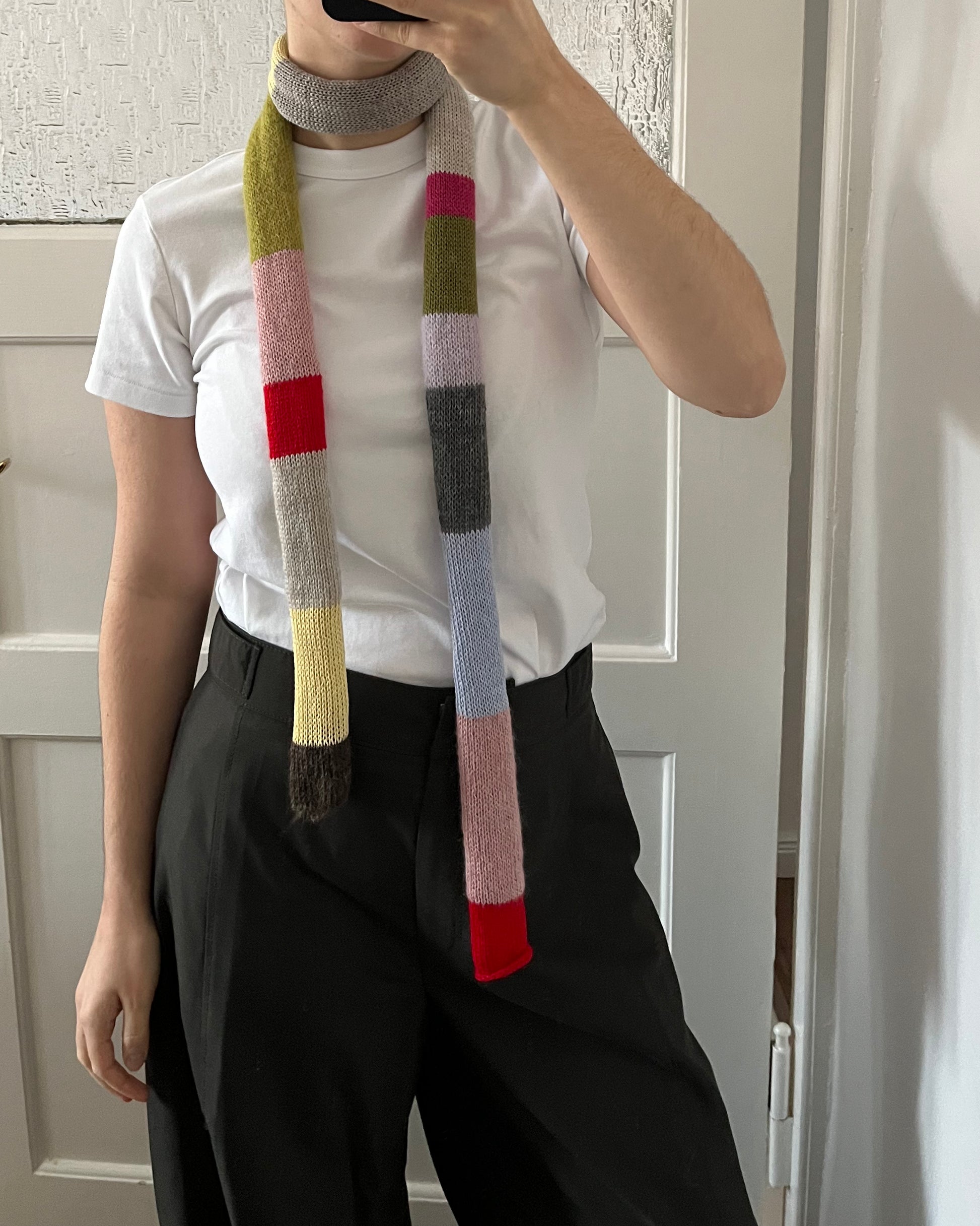 This is a one of a kind tiny knit scarf made of multiple materials: