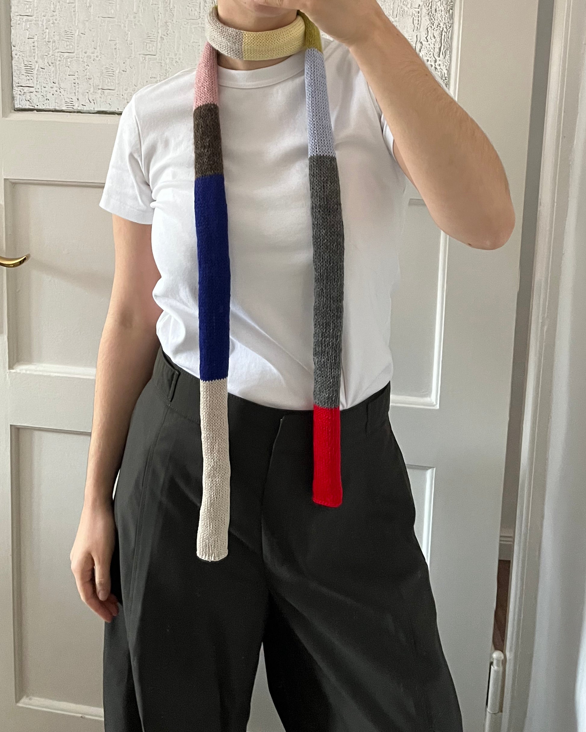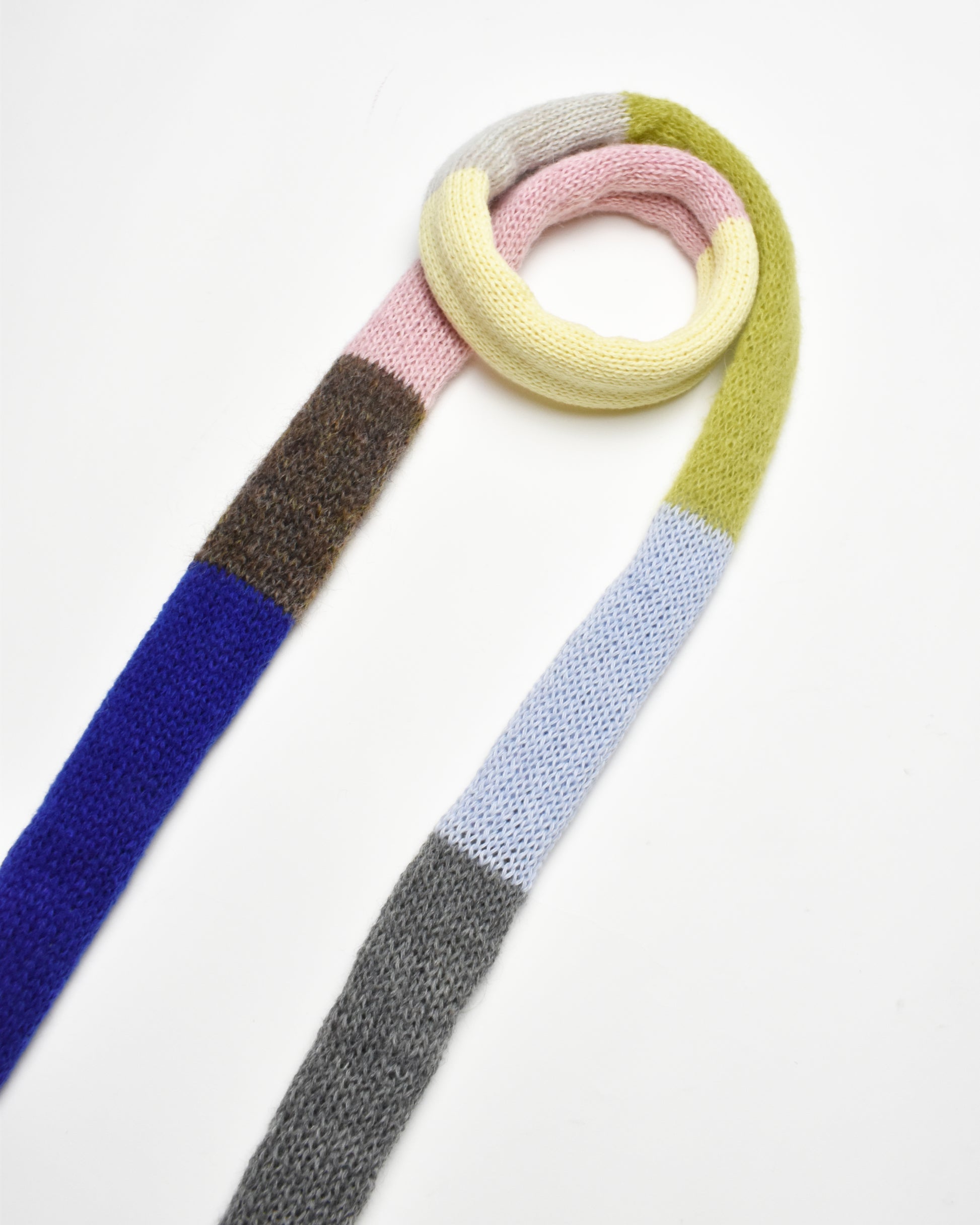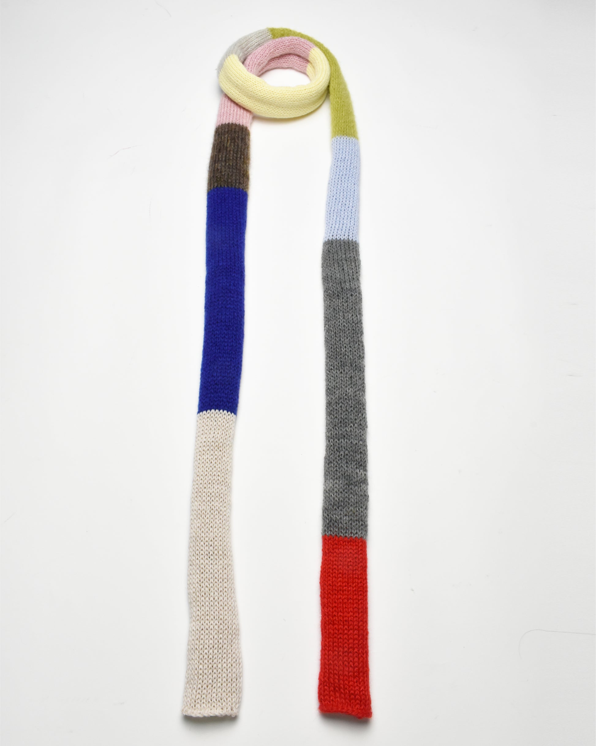 This is a one of a kind tiny knit scarf made of multiple materials: