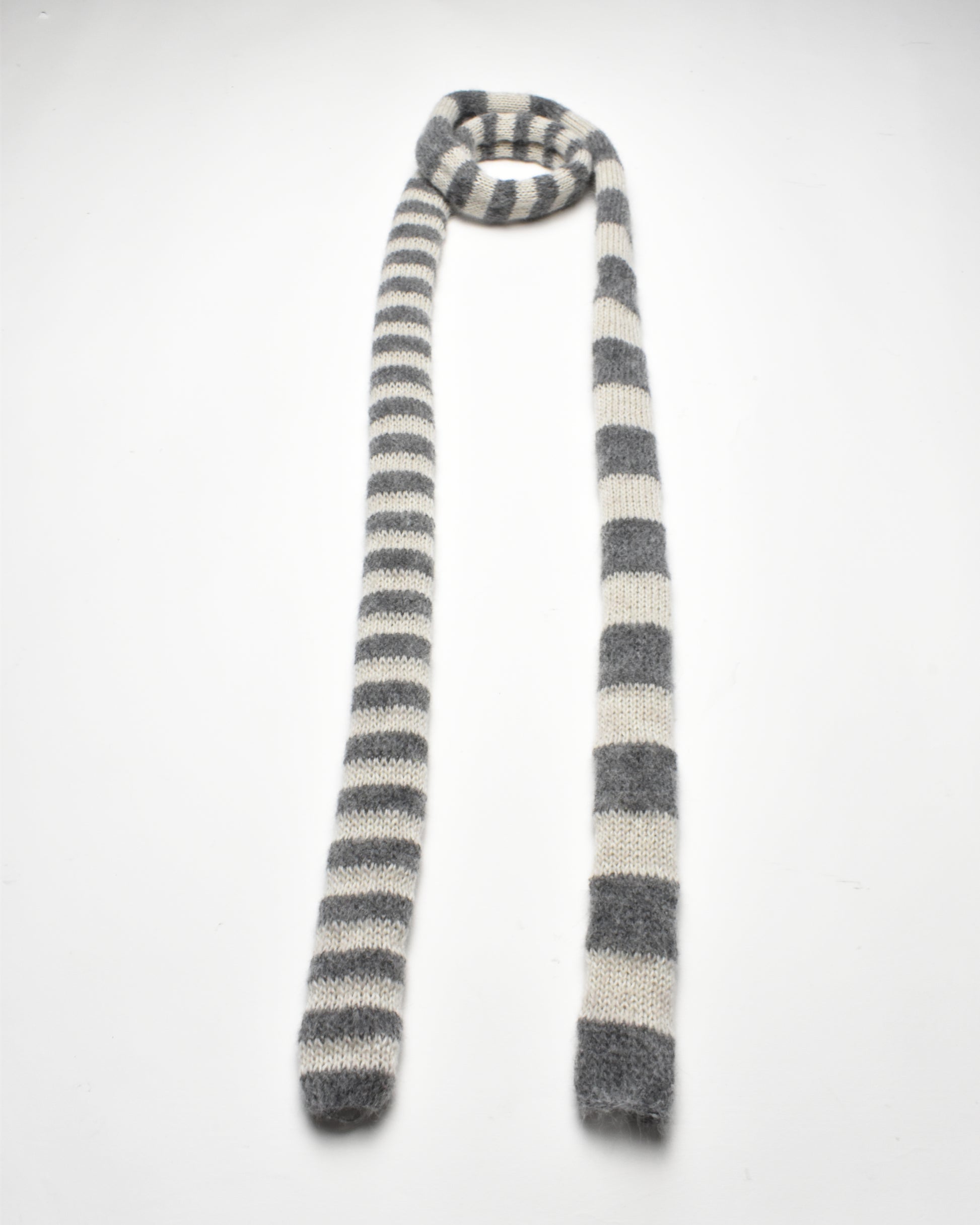 This tiny knit scarf is made of multiple materials:
