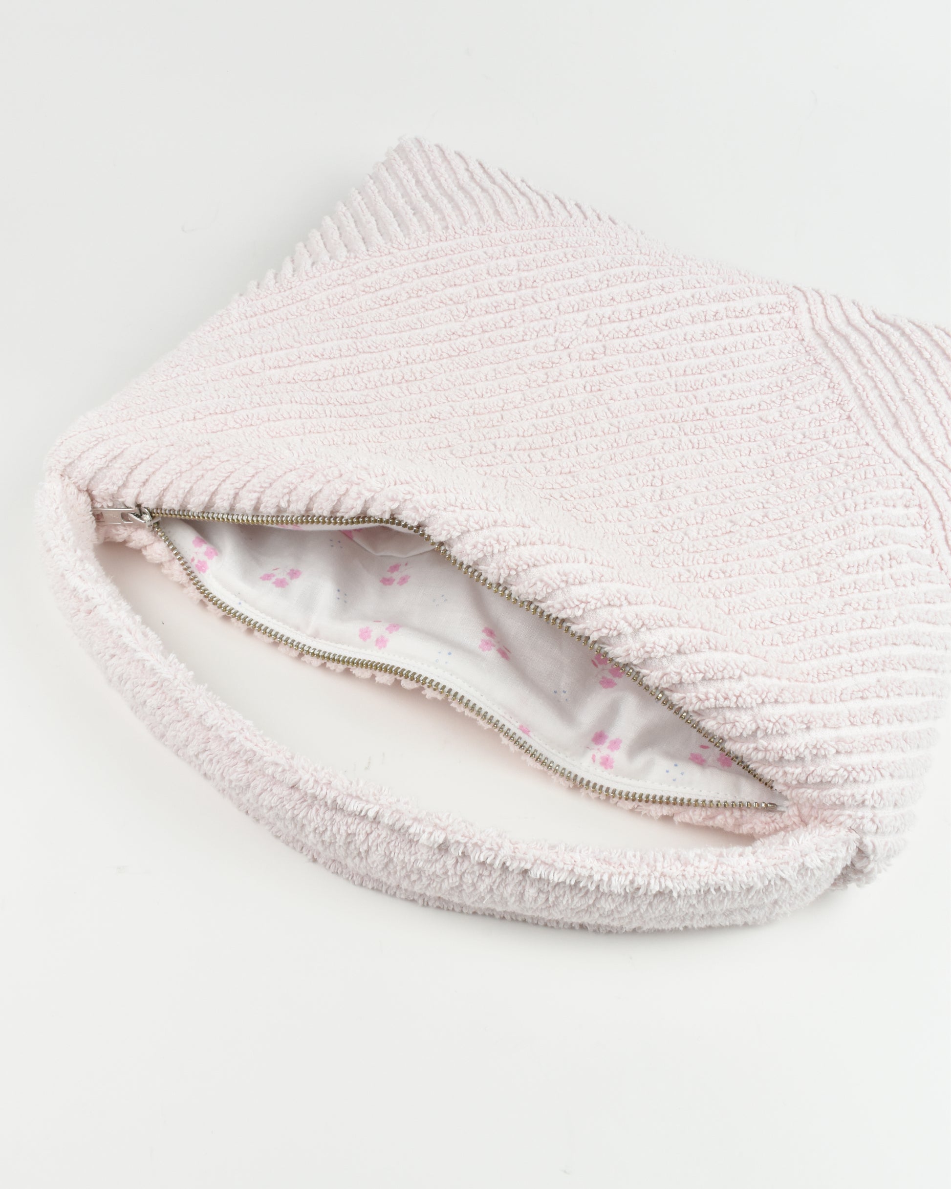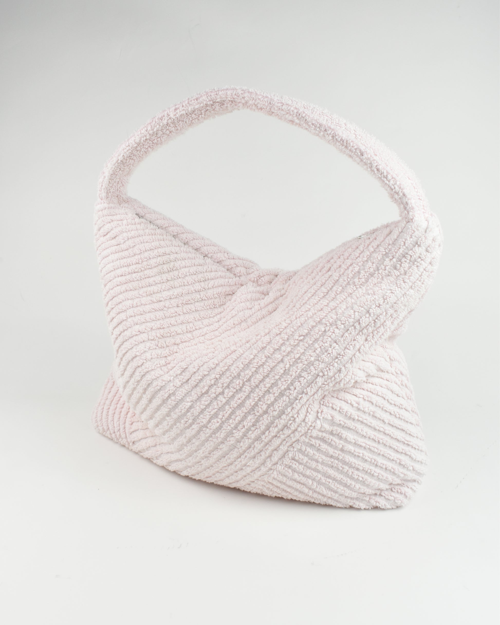 Crafted from repurposed vintage towels, each bag is one of a kind. Lining is made from reworked vintage duvet covers.